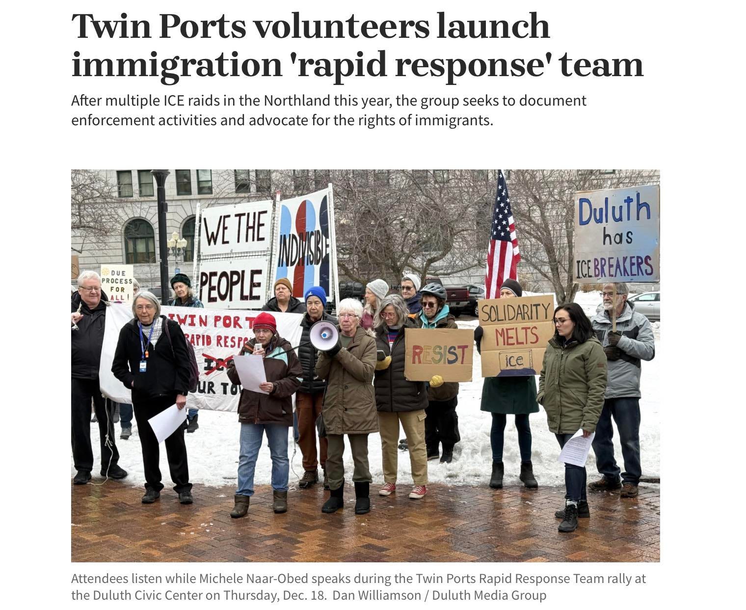 We had already begun the process of forming a rapid response team in Duluth. We were trained and supported by the Immigrant Defense Network based in Minneapolis. We got word that 300+ ICE and federal agents were coming to Minnesota. We didn’t know if, when, or how many of them would come to Duluth.
